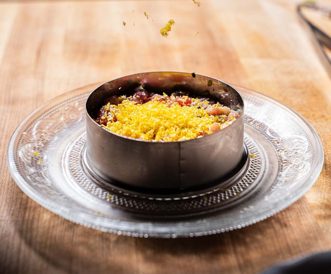 NY beef tartare, tuna mojama, yolk emulsion.